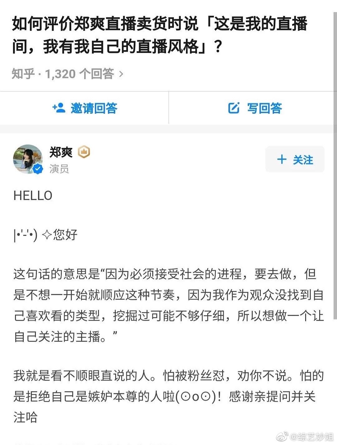 鄭爽 知乎 : 郑爽在知乎里回应了直播争议 说自己就是看不顺眼直说的人