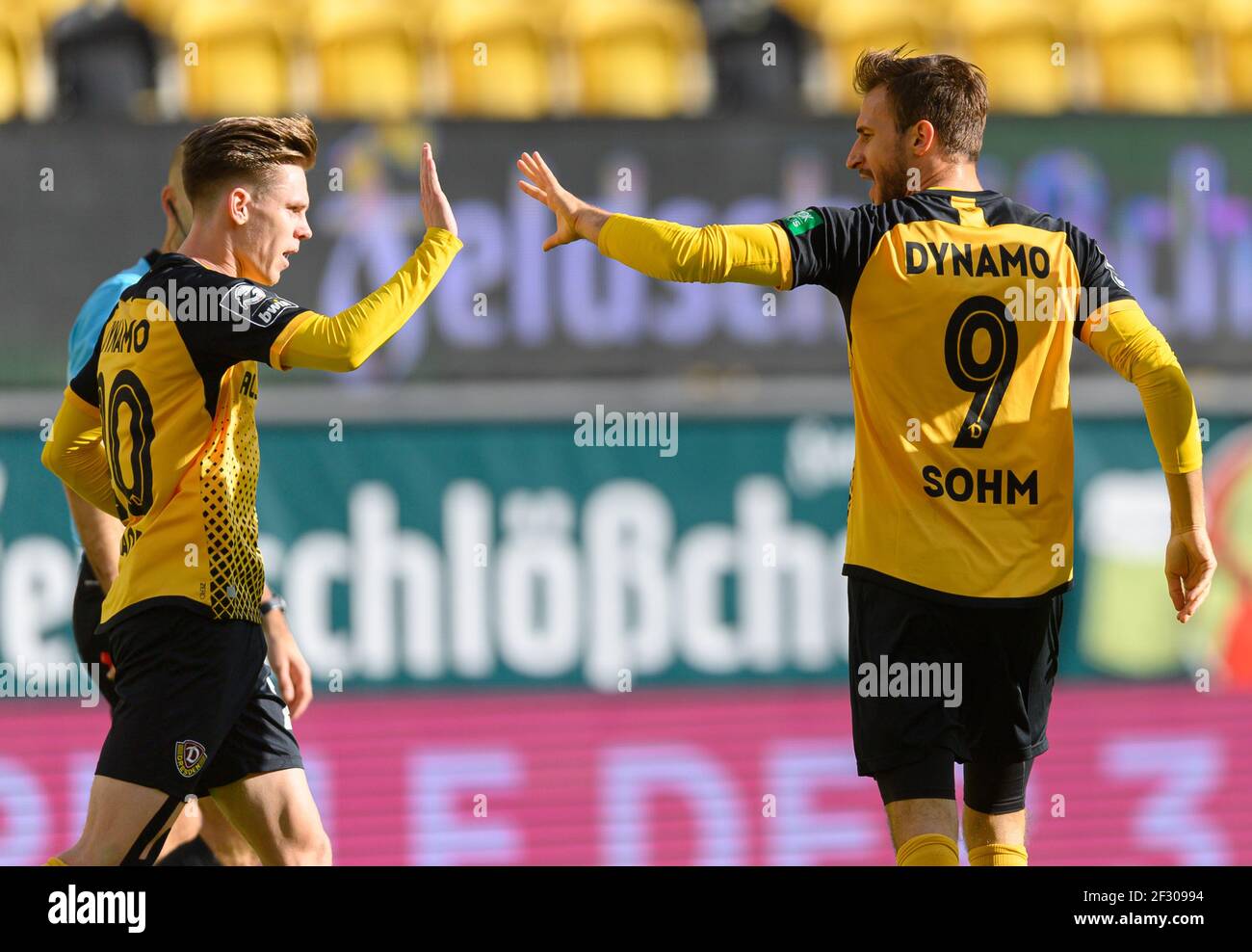 Dresden Germany 13th Mar 2021 Football 3 League Sg Dynamo Dresden 1 Fc Saarbrucken 28 Matchday At Rudolf Harbig Stadion Dynamo S Pascal Sohm R Celebrates With Julius Kade After His Goal To Make